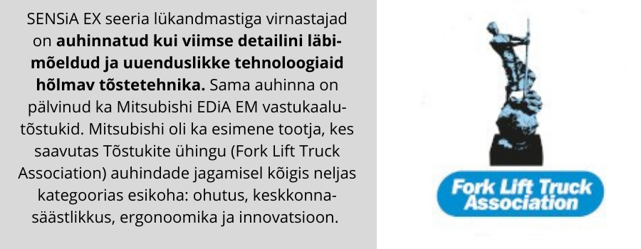 Mitsubishi tootevalik on viimastel aastatel läbinud põhjalikud uuendused ning on pälvinud mitmeid kaalukaid auhindu saades seeläbi usaldusväärsuse ja kvaliteedi sünonüümiks. Nende rohelist värvi tõstukeid võib kohata üle kogu maailma. Mitsubishi tõstukeid iseloomustab uuenduslik disain, kompromissitu kvaliteet ja tipptehnoloogia. Samal ajal on nende masinad auhinnatud parima juhitavuse, kütuse säästu ja madalate heitmekoguste saavutamise eest.
